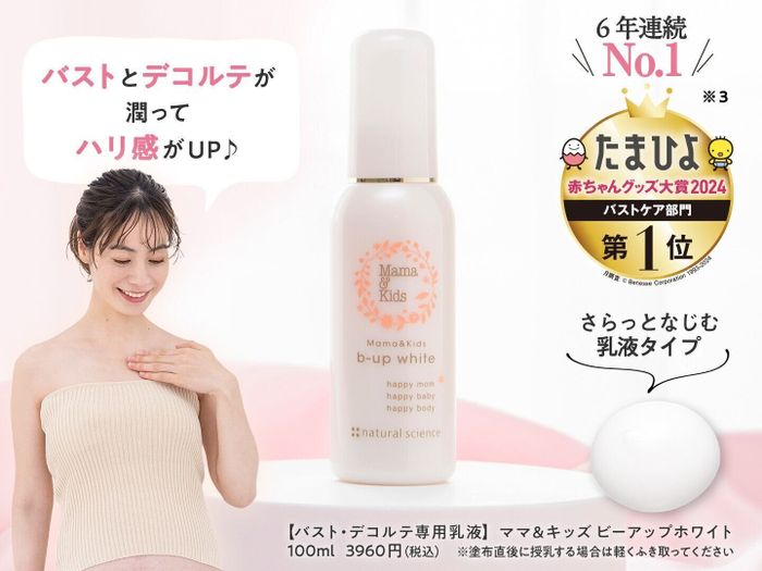 お腹だけではなくおっぱいも大きく変化する妊娠中と産後。サイズが大きくなるバストを支えるデコルテにまで使えるバスト専用乳液「ママ&キッズ ビーアップホワイト」も、産後ママさんからの熱烈支持を得たアイテムです。産後に後悔しないためにも、早めのバストケアを始めましょう!