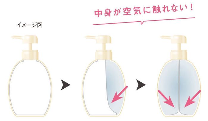 使用するにつれ内袋がつぶれていくフレッシュインナーバッグ方式の容器は、中身が空気に触れない構造。雑菌の混入や酸化による品質低下を防止して、最後までしっかり使い切れるように配慮されています。