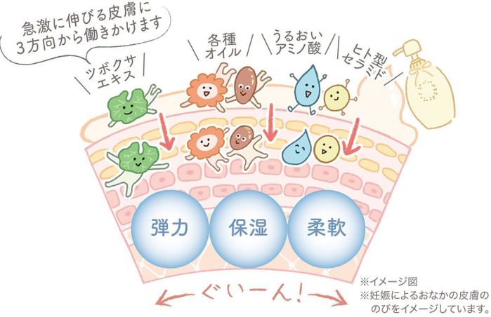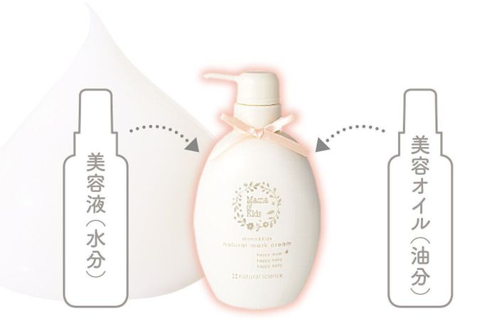 「ママ&キッズ ナチュラルマーククリーム」には、うるおいはもちろん、やわらかく弾力のある肌へ導く美容液と美容オイルを配合。美容液には大注目のCICA(ツボクサエキス)、美容オイルにはカレンデュラオイルやアルガンオイルなどが含まれています。これ1本で、妊娠ボディに必要な水分と油分を惜しみなく与えることができるというわけです。