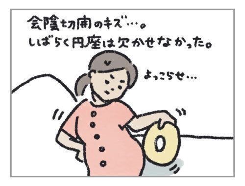 分娩時に、会陰切開をしました。会陰切開自体は、いきんでいる最中だったので全く意識することなく、傷を縫うときも麻酔が効いていたので大丈夫だったのですが・・・そのあとはしばらく痛みが続き、痛み止めの薬を飲んでいました。当然、座るときには痛いので、円座は欠かせませんでした。
