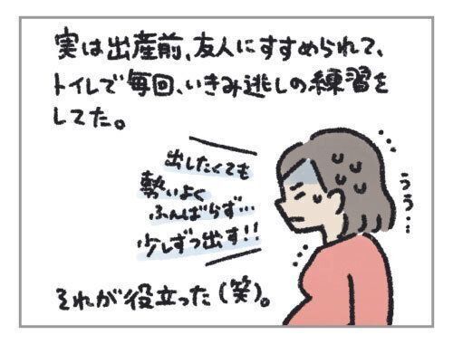 実は出産前、友人に勧められて、トイレで毎回、いきみ逃しの練習をしていました。出したくても、勢いよくふんばるのを我慢し、少しずつ出す練習、です。。(お食事中の方、すみません!!)