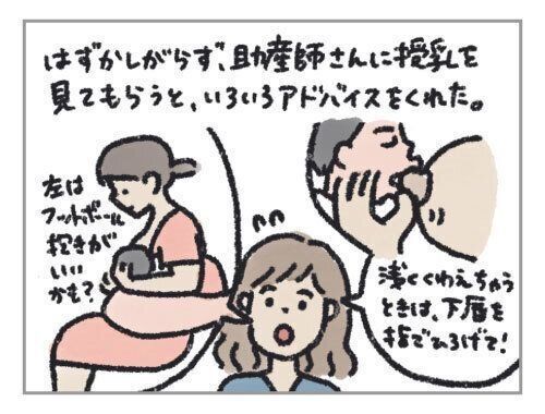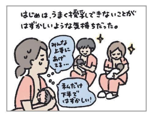 なかなかお乳が出ず(第6話参照)、授乳に時間もかかっていた私は、うまく授乳できないことが、恥ずかしいような気持ちでいました。授乳ルームで見る他のママたちは、なんだかすごく上手にあげているように見えて・・・。自分だけが下手なような気がして、コソコソと授乳していました。
