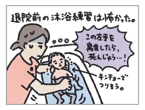 退院前に、沐浴練習がありました。息子の首を支える左手がプルプルしてしまって、「左手がつらい!でも、この左手を離したら、息子が死んじゃう・・・!」と思って、すごく怖い気持ちになりました。