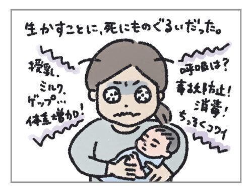 本当に、産後の新生児期は、子どもを生かすことに、死に物狂いでした。授乳やミルクの後にはゲップをさせないと、吐き戻して詰まってしまうかも。体重をきちんと増加させないといけない。呼吸はちゃんとしてる?事故防止、消毒しなきゃ・・・などなど。出産を経て、お腹の中で命を育む重責(「妊婦のハッケン」第1話参照)からは解放されましたが、今度はお腹の外で、命を預かる重責がのしかかったのです。