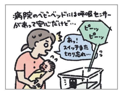 私の産院のベビーベッドには、呼吸センサーが仕込まれていました。赤ちゃんの呼吸が感知されなくなったら、音がなり、助産師さんにも知らせが行くようになっていました。入院中は、抱っこする時にスイッチを切るのをしょっちゅう忘れてしまって、大変でしたが・・・