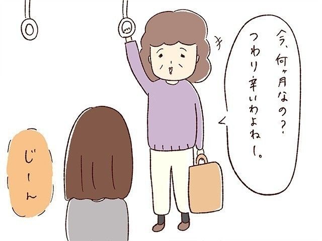 「つわりでしょ?辛いわよね」「私もつわり中姑にいびられて大変だったのよ」「今度孫が産まれるのよ〜。人生あっという間よ。」