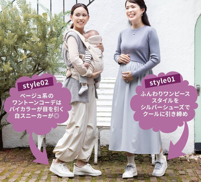 軽くて履きやすいのに、見た目はおしゃれなデザインの「スパットシューズ」を、妊婦さんとママでそれぞれスタイリング。ワンパターンコーデになりがちな時期こそ、足元でおしゃれを楽しんでみて♪