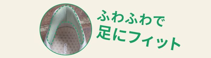 かかとを包み込むようにふわふわのパッドが施され、履き心地バツグン。足にフィットして脱げにくく、歩きやすさもサポートします。