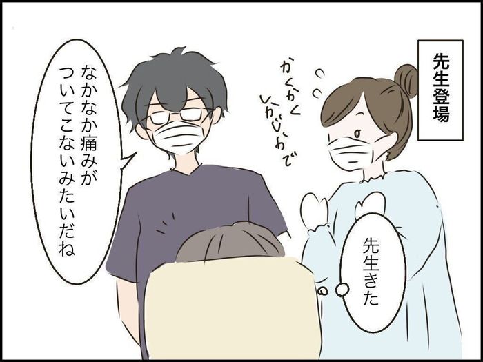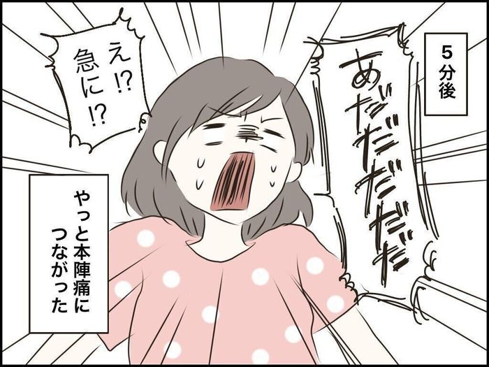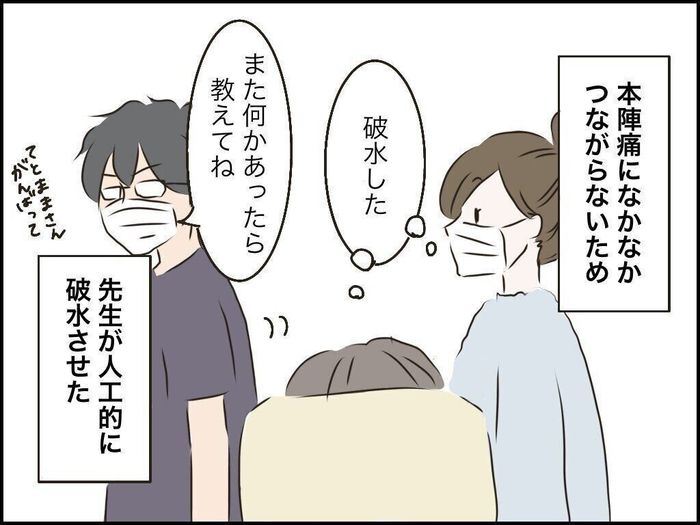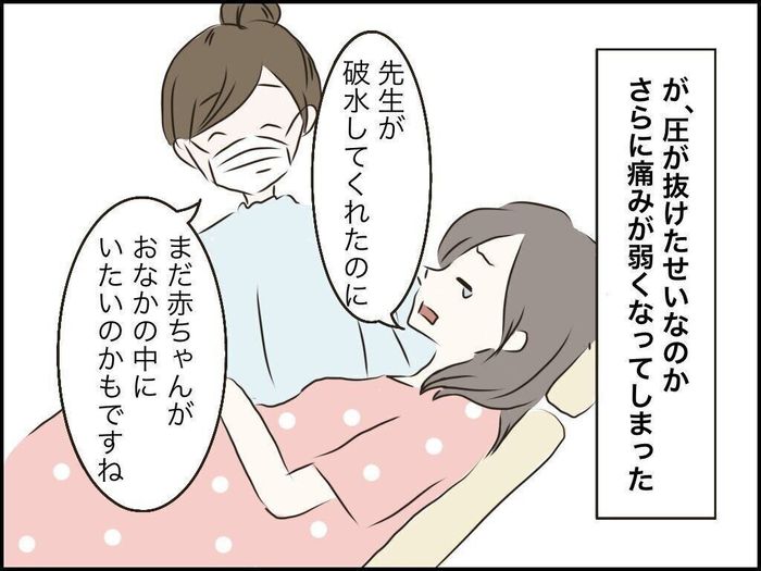 なかなか本陣痛につながらないため、先生が人工的に破水をすると圧が抜けたためかさらに痛みがなくなってしまいました。