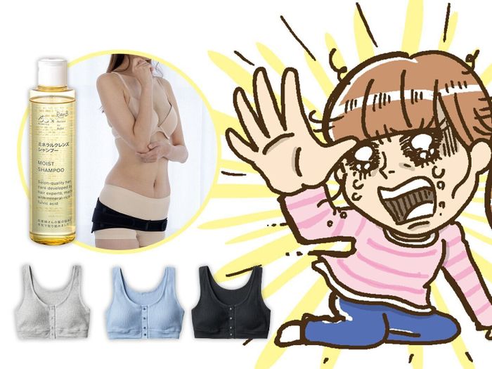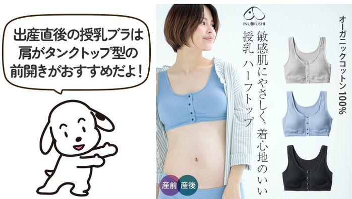 出産後、母乳の分泌が本格的にスタートし、バストが張りやすくなります。ブラジャーのストラップが触れただけで痛みや刺激を感じることがあるので、肩がタンクトップ風のハーフトップを用意しておくのがおすすめ。前開きのタイプなら、授乳や搾乳、母乳外来の際にも便利です。