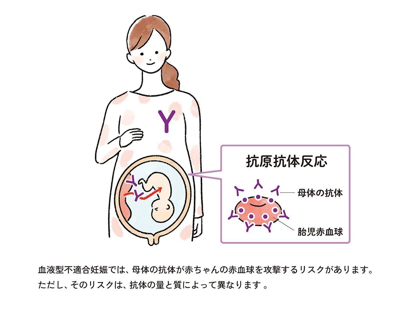 お母さんとおなかの赤ちゃんの血液型が違うとき、母体は赤ちゃんの血液を「異物」とみなして、赤ちゃんの赤血球に対する抗体を産み出します。その抗体が赤ちゃんの健康に悪影響を及ぼす状態を「血液型不適合妊娠」といいます。