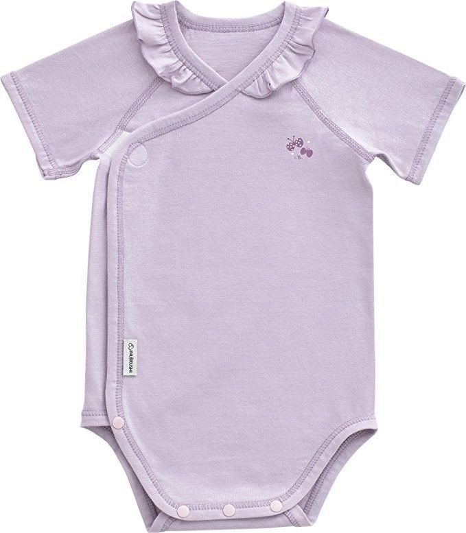 襟元のフリルと胸元の刺繍がキュートなボディ。打ち合わせが深いので、はだけにくく、冷えからもガード。合わせ部分はテープ仕様で着脱簡単。トレンドの上品なパープルで女の子らしいおしゃれが楽しめます!
