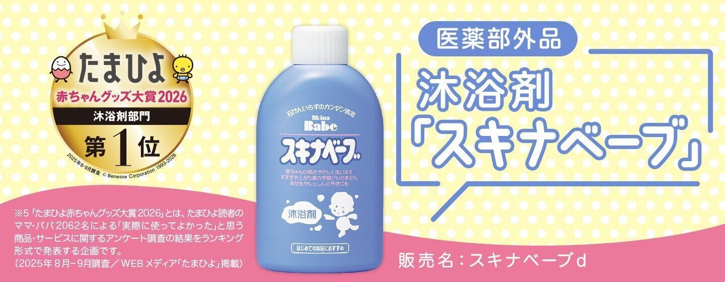 「スキナベーブ」は、1970年の発売から50年以上、多くのママ・パパを支え続けている石けんいらずの沐浴剤です。準備も超簡単! ベビーバスに「スキナベーブ」をキャップ1杯入れるだけ。泡が立たないのですべりにくく、沐浴が心配という新米ママ・パパも安心です。沐浴卒業後は、お風呂に入れて家族みんなで入浴剤としても使えます。