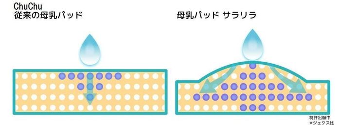 発売直後から高い人気を集めている「ChuChu 母乳パッド サラリラ」。特に、これからの蒸し暑い季節に使いたいママのお役立ちアイテムです。その理由のひとつは、母乳の吸水を1カ所に集中させず、拡散させて全体で吸収する点。また、逆戻りを防止するから、ムレずにサラサラ感が長続きします。