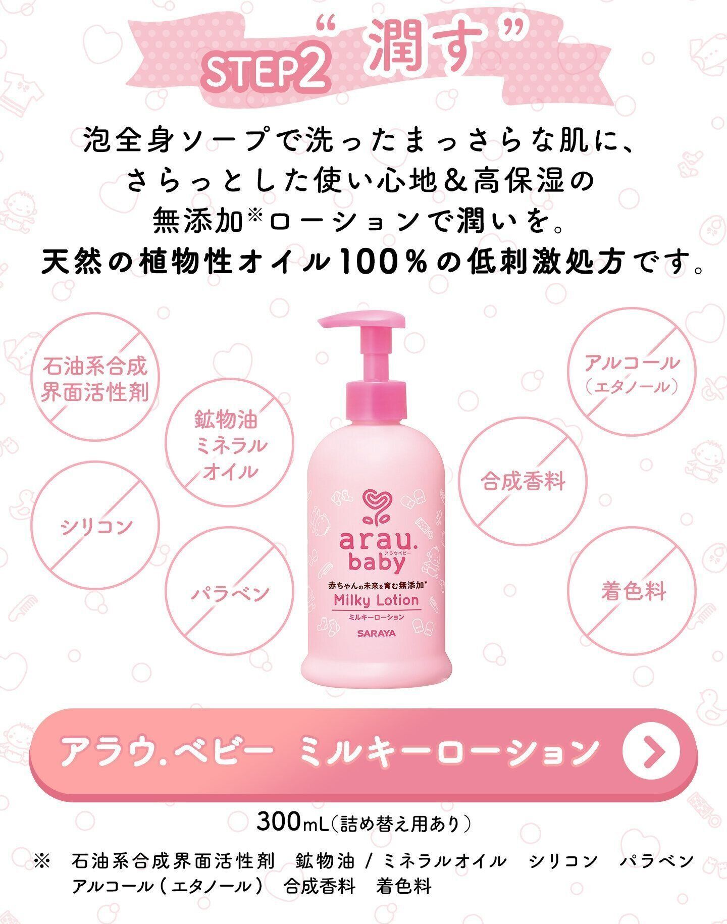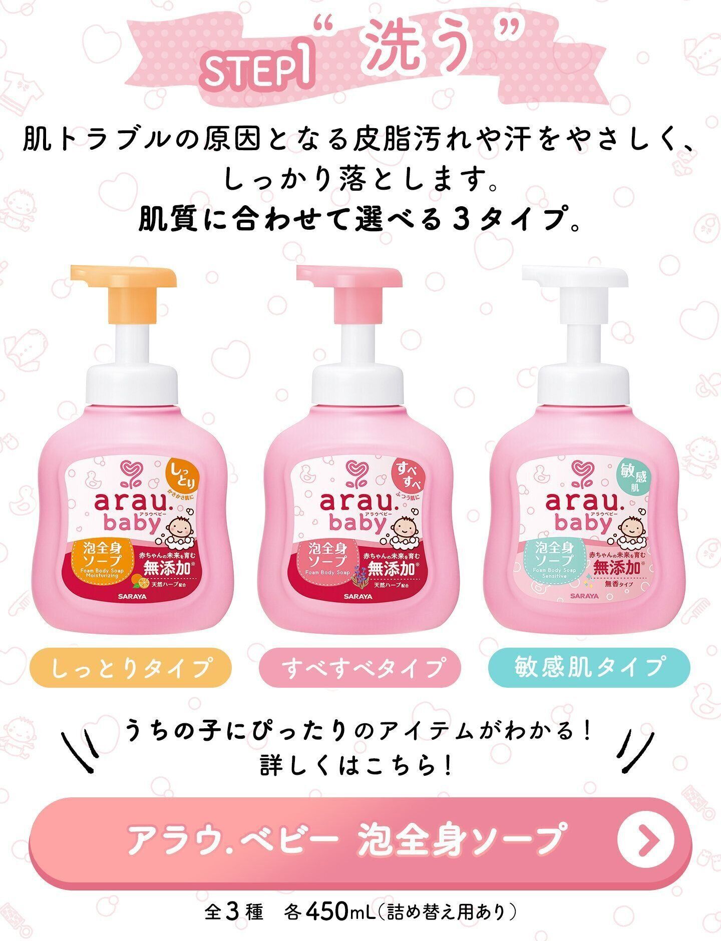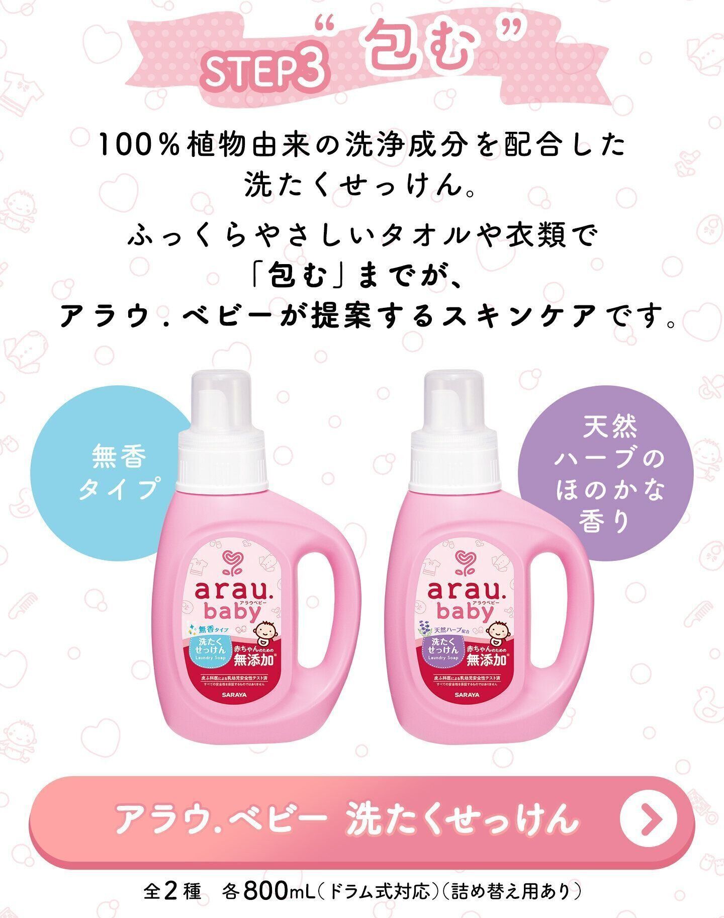 「アラウ.ベビー」は、「洗う」「潤す」「包む」の3STEPスキンケア