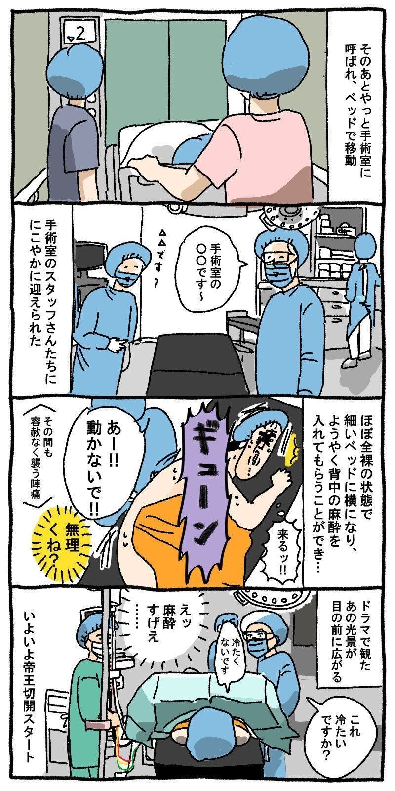 麻酔入れたら陣痛もスーッと無くなって、なんか氷みたいなのをおなかに当てられたけど、何当てられたかわからんぐらい感覚無くなって、ただただ「すげえ」だった。