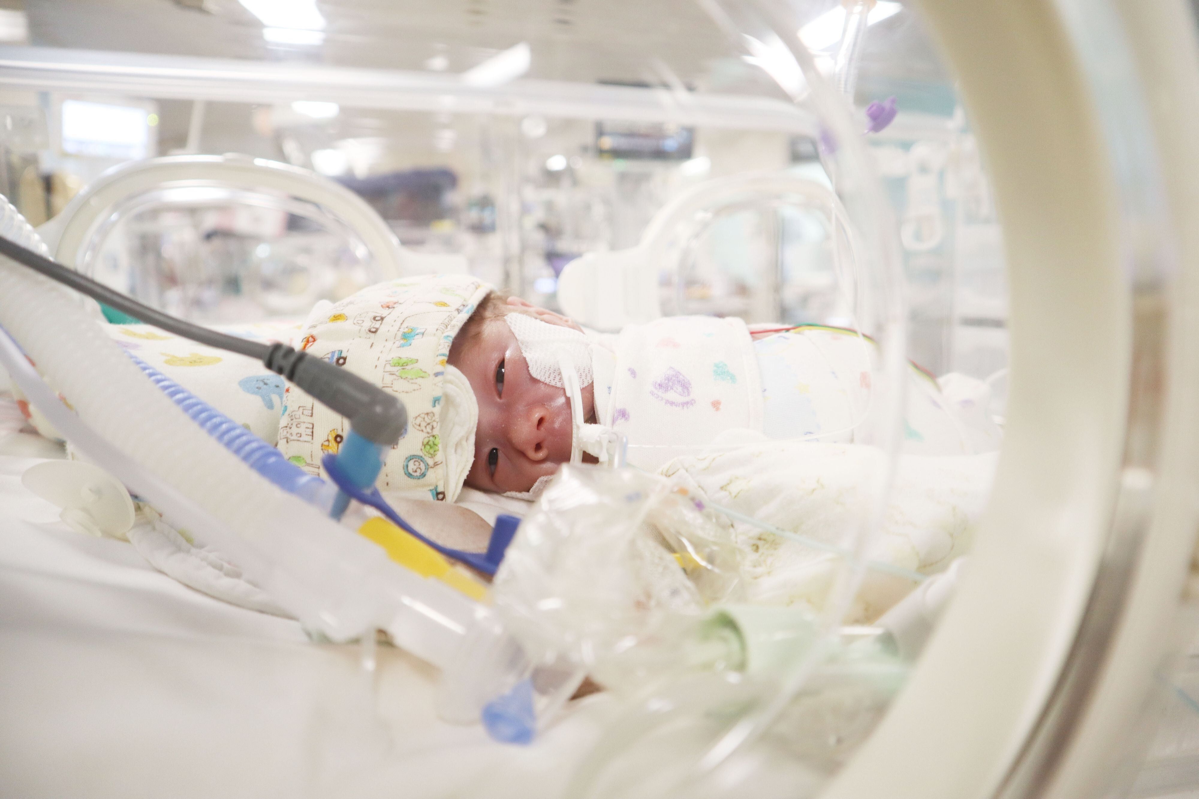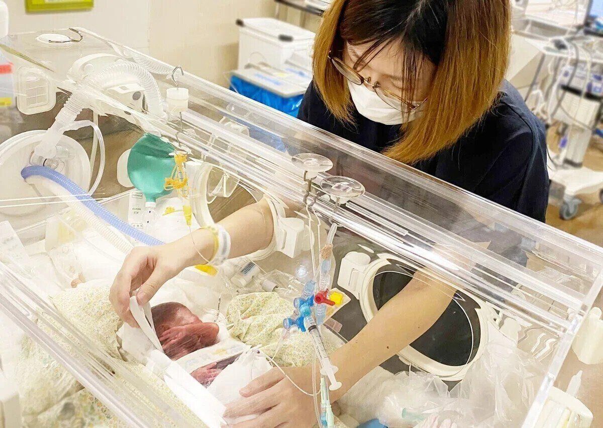 「NICUで保育器にいる2人は、口やへその緒に治療のための管が何本もつなげられていました。2人の腕は私の人差し指くらいの太さで、皮膚は真っ赤で、体は小さく細く、頭は軟式野球ボールほどの大きさで、ふにゃふにゃしています。