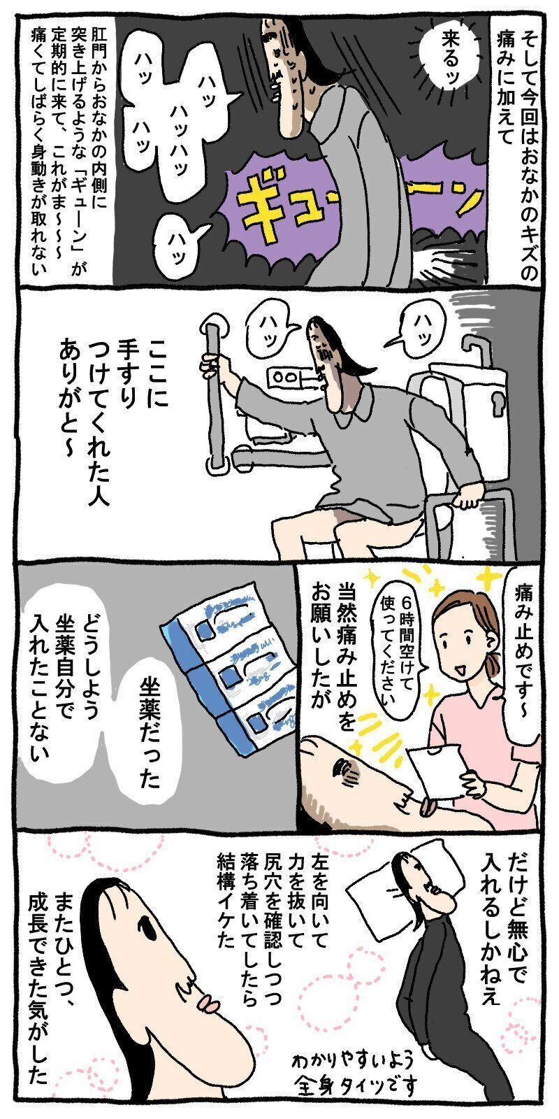 坐薬はたぶん頼んだら入れてくれたんだと思うけど、当然自分で入れるものとして渡されたから「みんな自分で入れてるんだ…やるしかねえ…」と覚悟を決めて頑張りました。