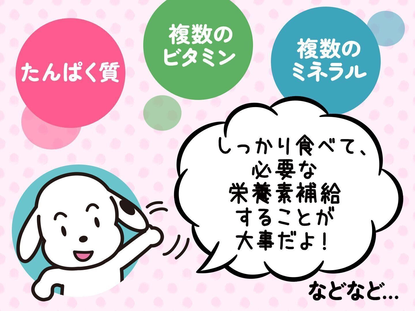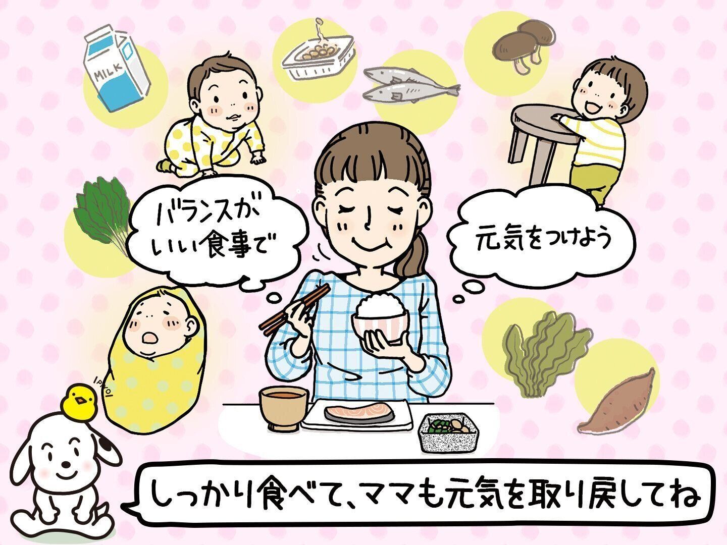 出産で消耗した体力や、慣れない育児による疲労を回復させるためには、十分なエネルギーと栄養素の補給が不可欠です。ママ自身の元気をつけるためにもバランスのよい食事をとりましょう。