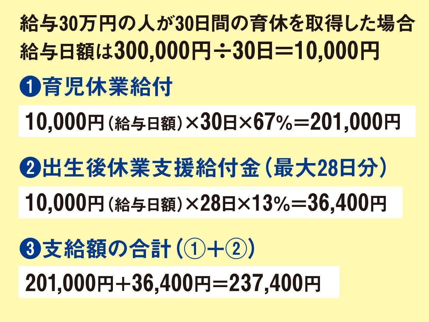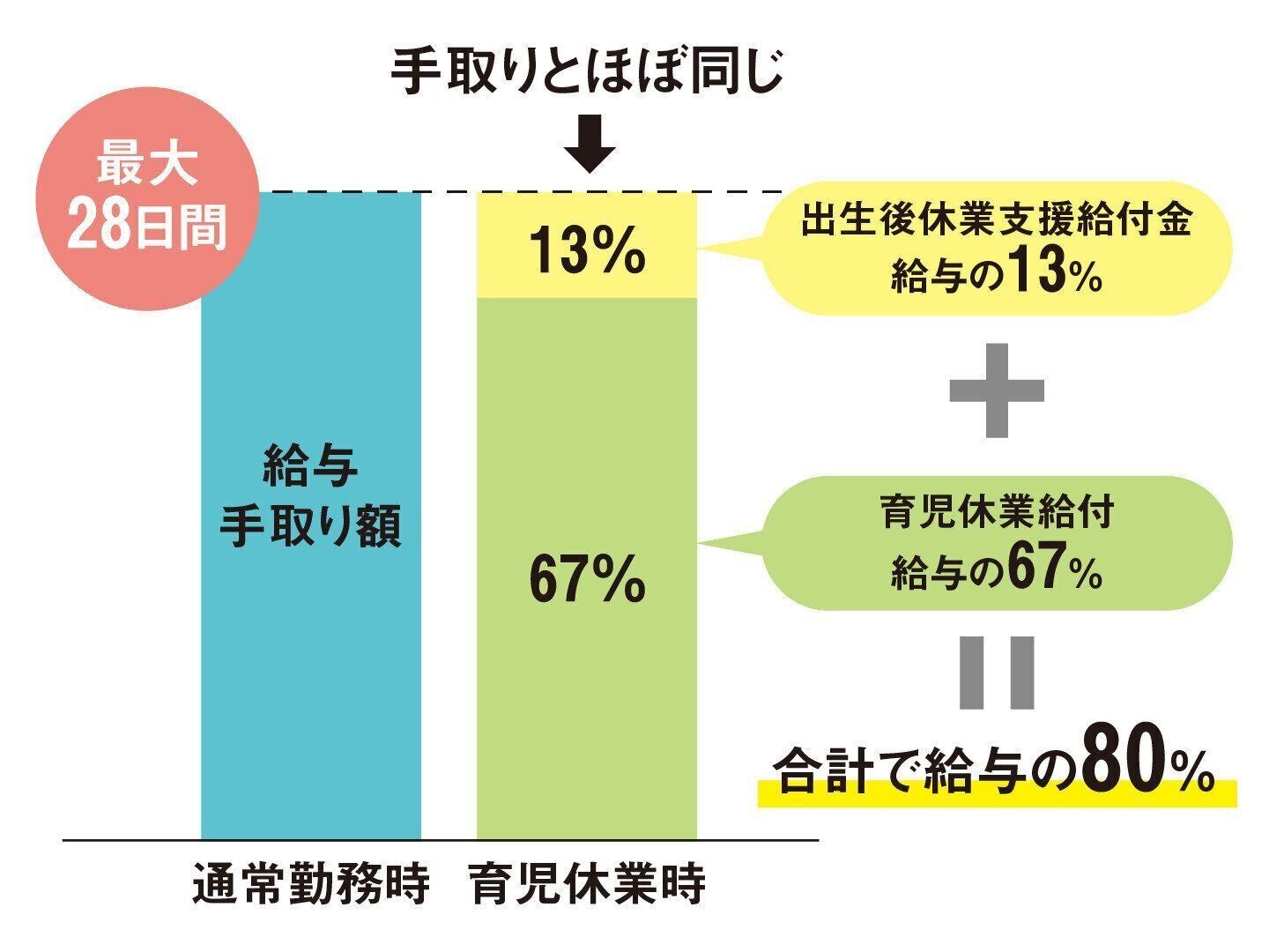 「育休を取りたいけど、収入減がネックになっている人」を後押しするためにスタートしたのが、「出生後休業支援給付金」です。この制度は、子どもが生まれた直後に、夫婦がともに14日以上の育休を取得すると、育児休業給付に13%の給付金が上乗せされ、通常勤務時と手取りがほぼ同じになるというものです。