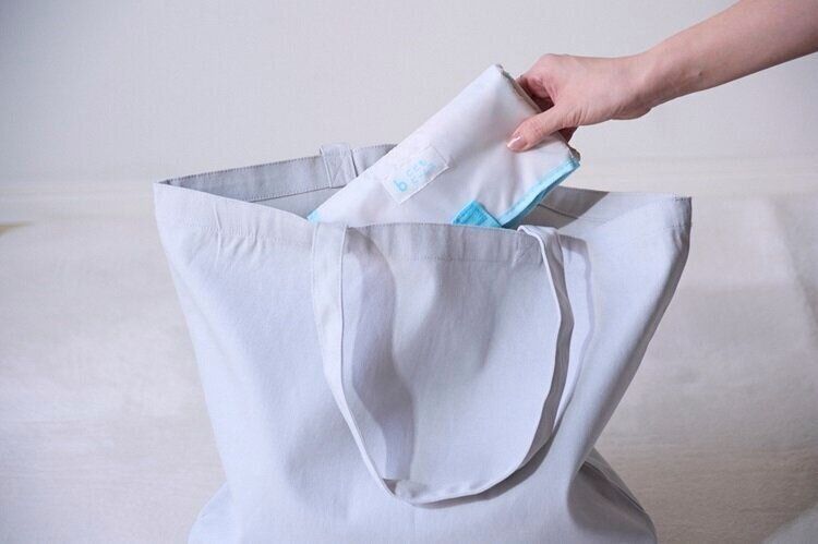 折りたたんで面ファスナーで留めると、約20×12cmのコンパクトなサイズになります。バッグの中でかさばることもなく、サッと取り出しやすいのもうれしい。