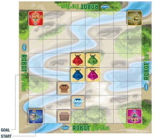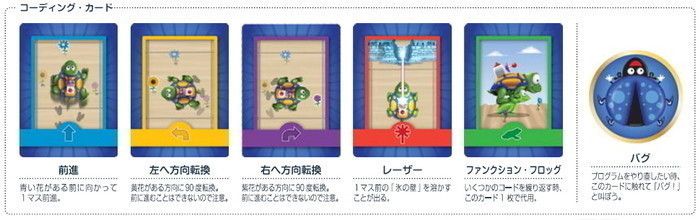 4歳から楽しめるように、遊び方はシンプル。カメが障害物を回避し、ゴールの宝石までたどり着くまでの道のりをコマンド(命令)カードを並べて遊ぶゲーム。命令が的確でないと、“バグ”が生じて宝石をゲットできないので、プログラミングで重要な“デバッグ”という能力が身につきます。