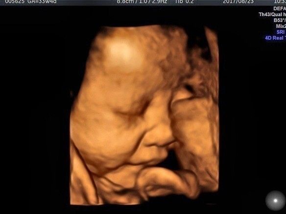 「3D超音波は、2次元(①縦軸②横軸)にプラスもう1次元(③奥行軸)の情報を組み立てることで、立体的な画像を見ることができるもの。断面的な2Dと異なり、表面的な状態が見えるので、赤ちゃんの顔立ちなどがわかります。この画像は、上の2D超音波と同じときに撮影した、妊娠33週の赤ちゃんの写真です。こうして見ると、違いは一目瞭然ですね」
