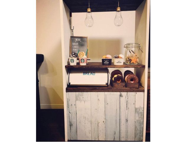 おしゃれなカフェ風のお店やさんカウンターをDIYしたのは、kanako kurokawaさん(@cyana_0622)。ごっこ遊びが好きな娘さんのためにつくりました。