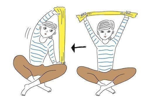 「産後すぐに起こりがちな授乳のトラブル。母乳は血液からつくられるので、おっぱいまわりの筋肉を伸ばすストレッチで、普段から血流をよくするのがおすすめ。腕を曲げずにすむ位置でバスタオルの両端を持ち、頭上に上げます。そのまま横に倒れ、1分キープ。わきが伸びているのを意識しましょう。赤ちゃんのお世話で筋肉がこった上半身も、すっきりしますよ」