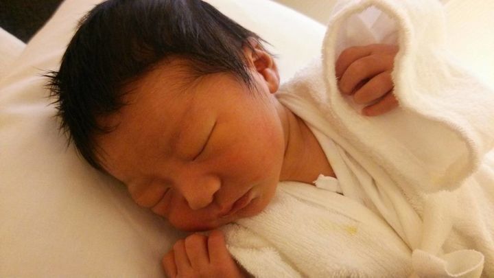 その後、数回いきむと燃えるように熱くなり、激痛のピークが。「次で赤ちゃんが出てきますよ」という助産師さんの言葉の後、最後の力を振り絞っていきむと、大きな赤ちゃんの泣き声が聞こえました。分娩室に入って20分足らずだったと思います。