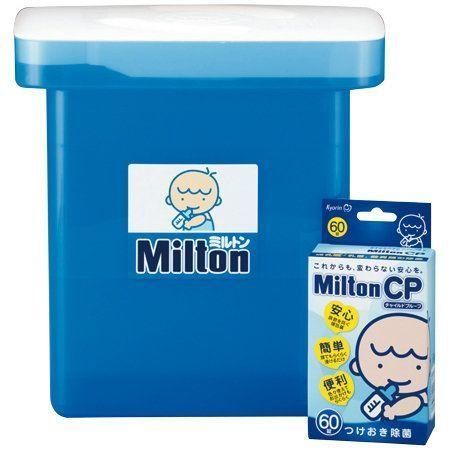 水に錠剤タイプのMilton CPを入れて作った薬液に、1時間以上つけるだけで哺乳びんが簡単に除菌できます。除菌後はすすがなくてもOK。食器やおもちゃなどのベビーグッズも除菌可能!