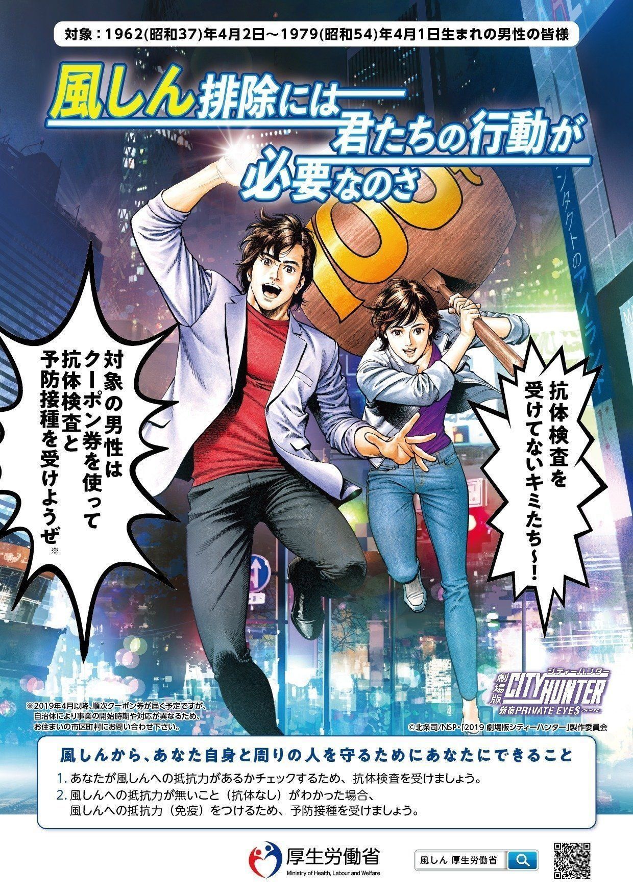 厚生労働省は、1962年4月2日から1979年4月1日生まれの幼少期に定期接種を公的に受ける機会のなかった男性に、風疹の予防接種の定期接種化(原則無料)を決定。2019年4月以降に全国で展開します。対象者には市区町村から順次クーポン券が届く予定で(*1)、対象世代の男性に人気の漫画「シティーハンター」を起用したポスターなどを使い、抗体検査や予防接種の啓発活動を開始しています。