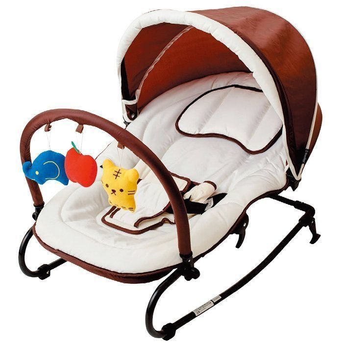 フラットの状態からチェアまで、4段階の角度調整が可能。日よけのホロのほかにもバウンサー全体を覆う、 虫・ほこりよけ用シェードもついています。キュートな鈴入りのトイも人気のヒミツ♥