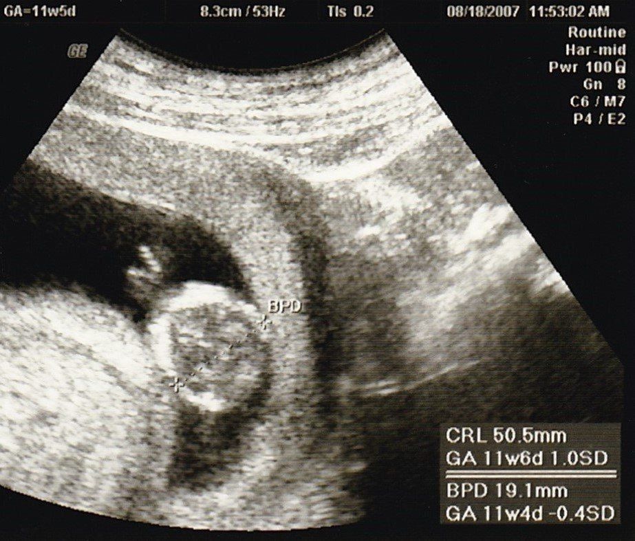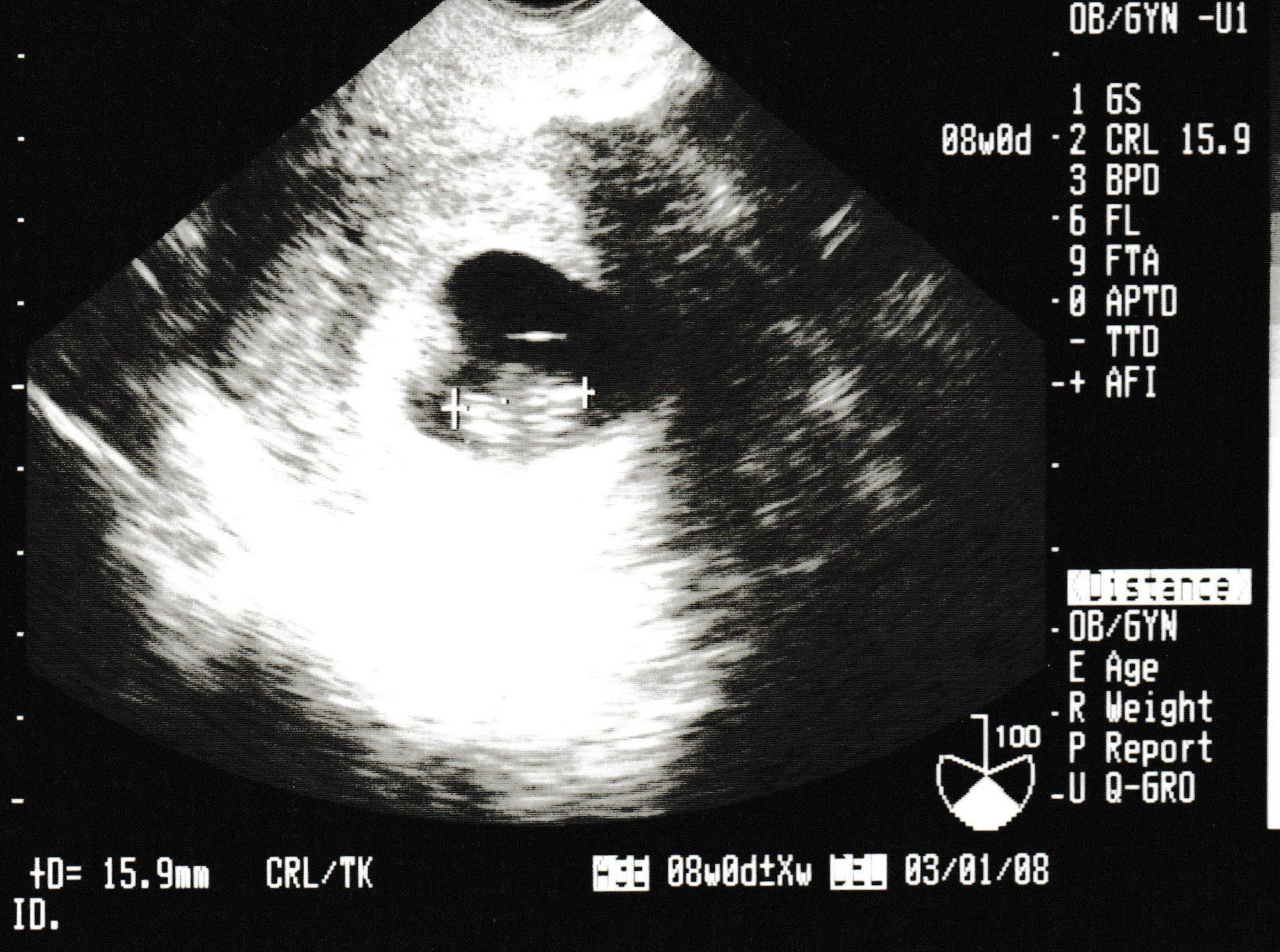 3回目の健診。赤ちゃんは小さく白いモヤモヤで写っているだけですが、今回から大きさを測定するようになり、出産予定日も判明。このころから胸やけのような気持ち悪さが始まり、常に何かを口にしたいという気分が続きました。やっと見えるようになった小さな赤ちゃんが、こんなに体に影響を及ぼすなんて、すごいなと妙に感心。