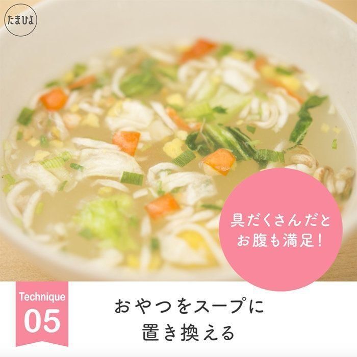 あっさりしたコンソメスープやトマトスープがおすすめ。スープの代わりに、温かいお茶をゆっくり飲むだけでもOK.。
