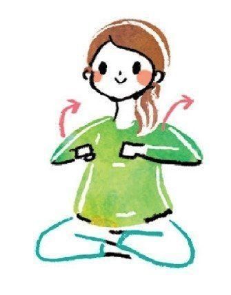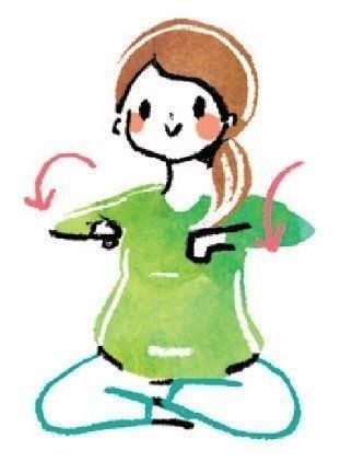 1.胸の前で軽くこぶしを握り、ゆっくりと大きく後ろに肩を回します。