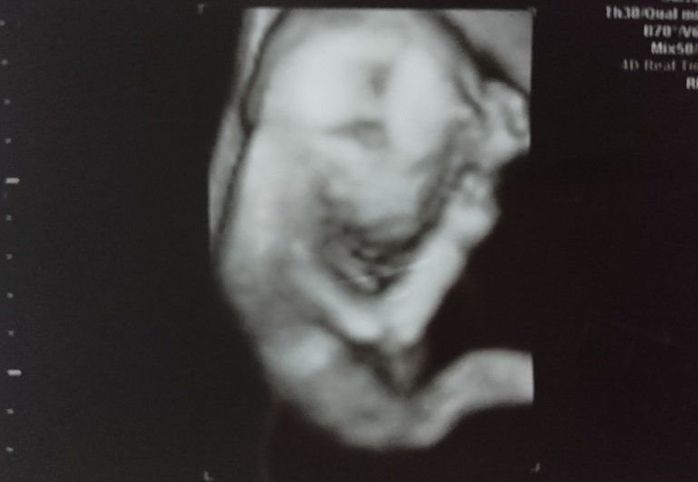 おなかはもうすぐ100cmに達しそうです。おなかが大きすぎて腰痛が悪化し、立っているのがつらくなりました。赤ちゃんにまつ毛やまゆ毛が生えてくる時期だそうです。エコー写真は大仏様のような穏やかな顔に見え、3D画像は外人さんのように鼻が高く見えたので、どんなイケメンなのか、息子に会うのがとても楽しみになりました。赤ちゃんの推定体重は1324gでした。