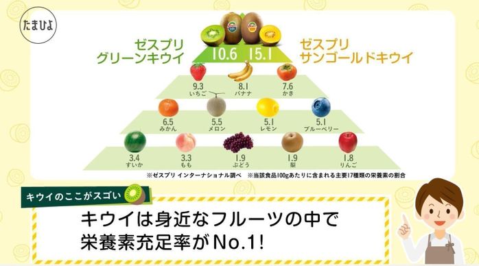 ビタミンCや食物繊維、タンパク質、鉄など、主要な17種類の栄養素がどれくらい含まれているかを比較した栄養素充足率スコアで、キウイはNo.1*。いろいろな栄養素がぎっしり詰まった果物なんです。