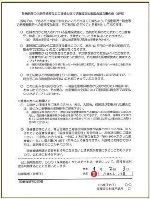 産院に「直接支払制度」を利用することを告げ、産院から提示される書類に必要事項を記入・捺印する。