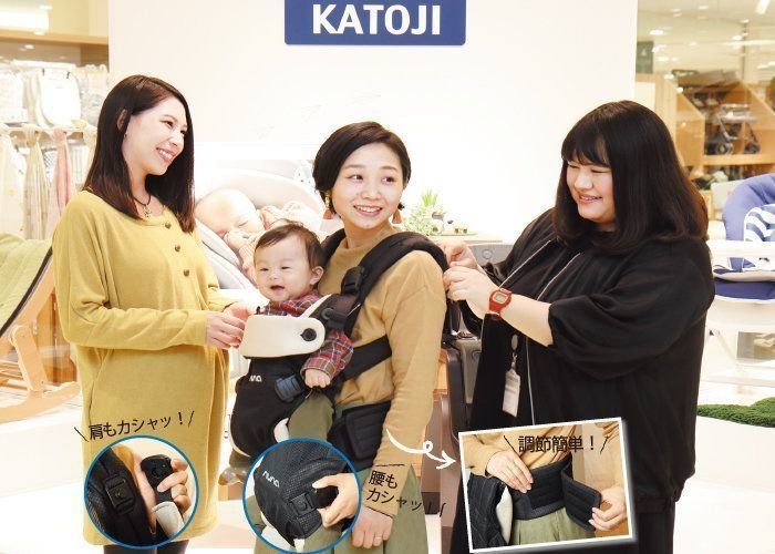ベビーグッズ専門店「カトージ」の直営店では、専門知識を持つ店舗アドバイザーが常駐。家の広さや普段の移動手段、車の有無など、詳しくヒアリングしながら、それぞれのライフスタイルに合うベビーグッズをアドバイスしてくれます。その場で商品の特徴や使い方を教えてもらいながら体験できるので、納得して選ぶことができるんです。