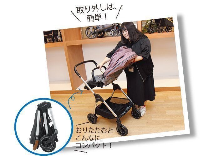 「横幅が52cmとコンパクトなので、駅の改札もラクに通れます。シートを取り外して向きを変えるだけで、対面と背面どちらでも使えますし、トラベルシステムにも対応しています。走行中の衝撃を吸収し、小回りがラクなゴムのシングルタイヤだから、押し心地がスムーズ。