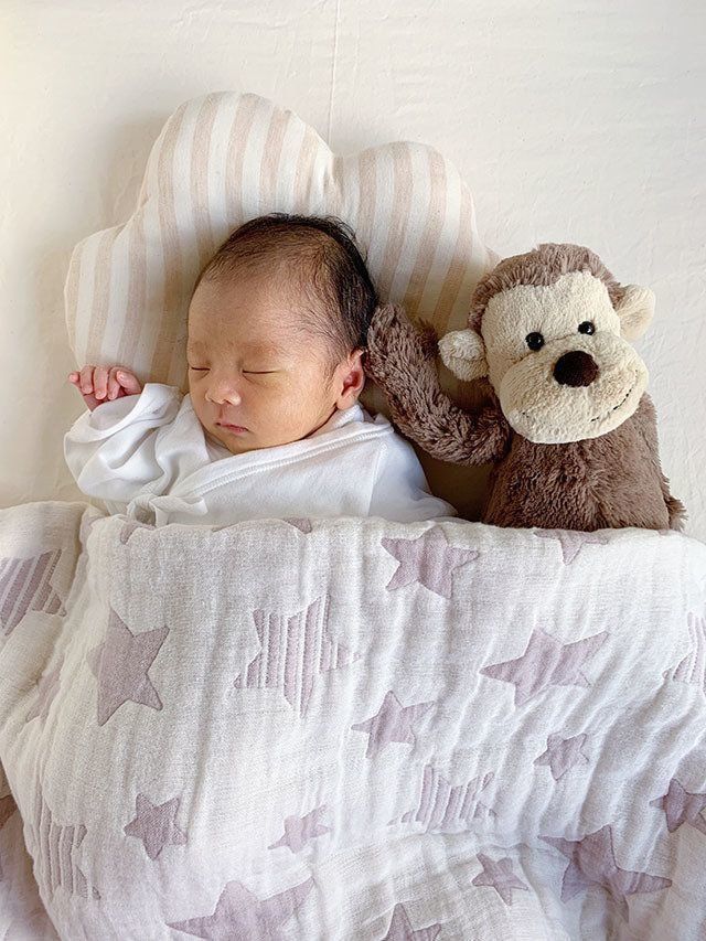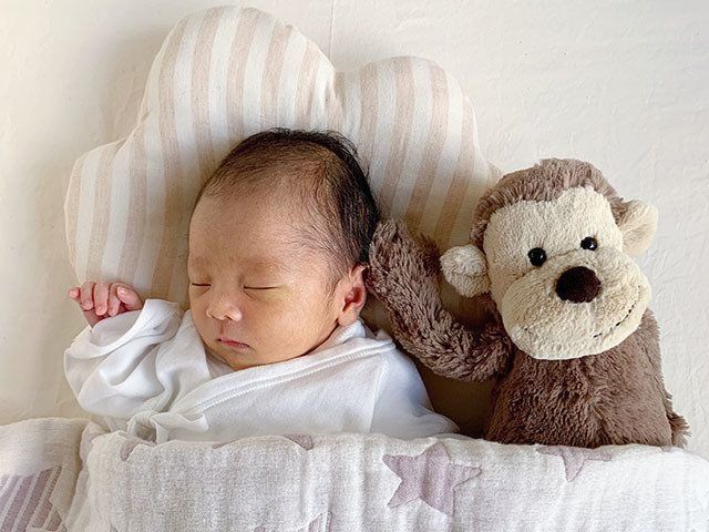 おなかにいる時から一緒に撮影していたので、産まれてからも今も大きさ比較できて良い記念になります。触り心地が良いからか息子も気に入ってくれて、入眠アイテムとしても活躍しています」