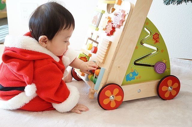 ・手押しぐるま……「ばあばサンタから届いたカラフルなしかけがたくさん付いている手押しぐるま。お座りが安定してきて座ったまま遊ぶようになりました。指先も器用に使えるようになって、楽しそうに遊んでいます」