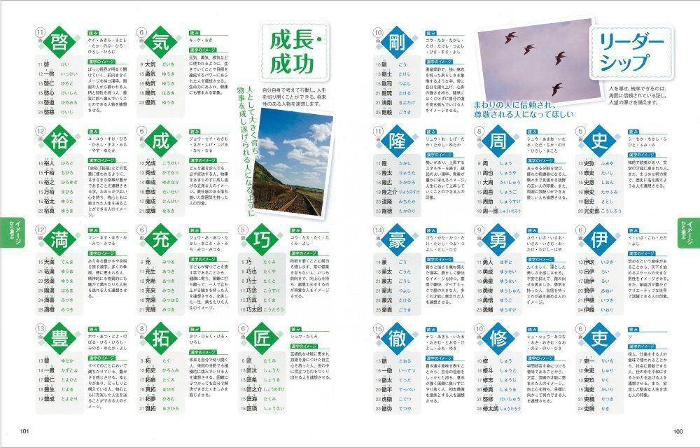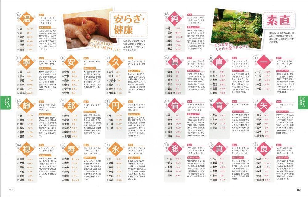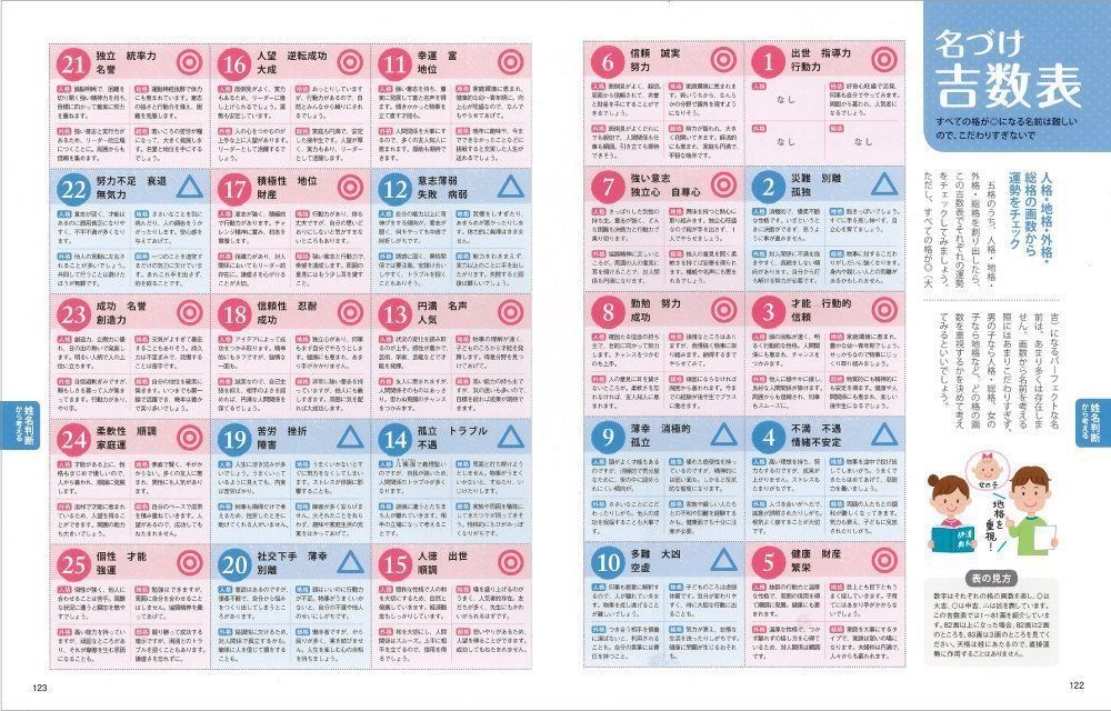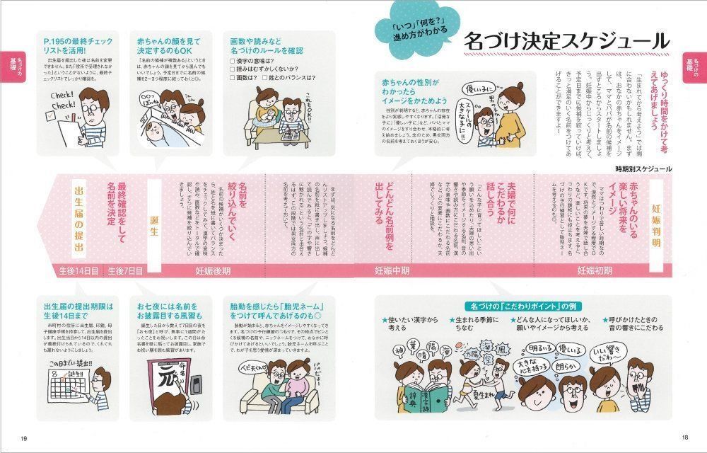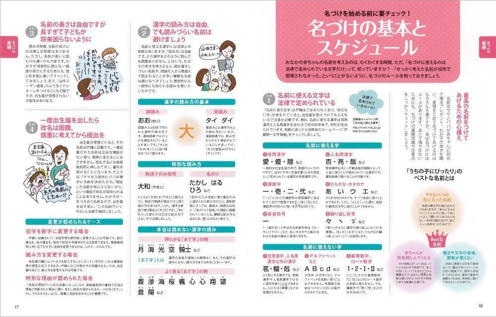 名づけの基本知識のほか、「音」「読み」「季節」「イメージ」「姓名判断」「漢字」などから名前を考えるステップと名前例を紹介しています。