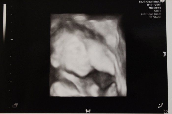 妊娠20週目の3D画像。早くも引っ込み思案な性格の表れか、エコー写真を撮ろうとすると胎盤の裏に隠れようとしています。何度も撮り直してようやく撮れたのがこちら。この頃、保健センターで催される母親学級で、産院が同じプレママと出会いました。