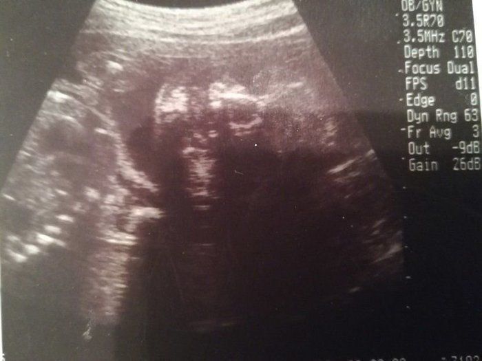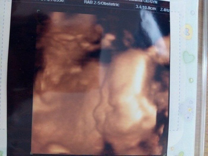 初めて4Dのエコーで検査をしました。この日に性別を教えてもらえることになっていたので、とても楽しみに臨んだ検査では、股をしっかり開いて「男の子」を主張してくれました。右側に映るのが赤ちゃんの横顔です。顔がはっきりと見え、嬉しくて何度も見返していました。でも鼻が低いのが私に似ているようで、「可哀そうに」とも思っていました。