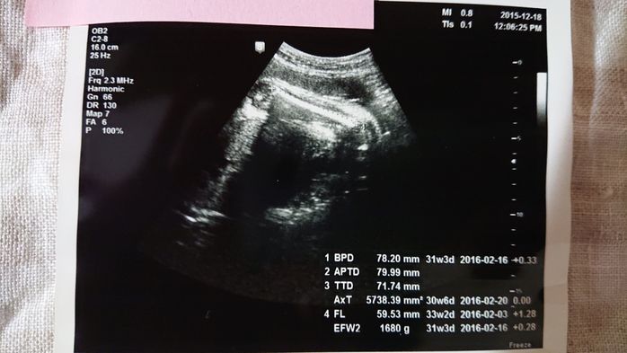 この写真を撮る2週間程前に切迫早産で入院してしまったのですが、入院してから初めて撮った30週目のエコー写真です。妊娠後期になってくると、赤ちゃんが大きくなりすぎて、ほんの一部しかエコー写真に写らなくなってきました。「赤ちゃんの顔が見たい」と思っても、この日は赤ちゃんの向きが合わずに見ることができませんでした。「赤ちゃんの向きによって、赤ちゃんの顔を見られずに終わってしまう時もある」と、医師に言われて、何だか残念に思ったものです。