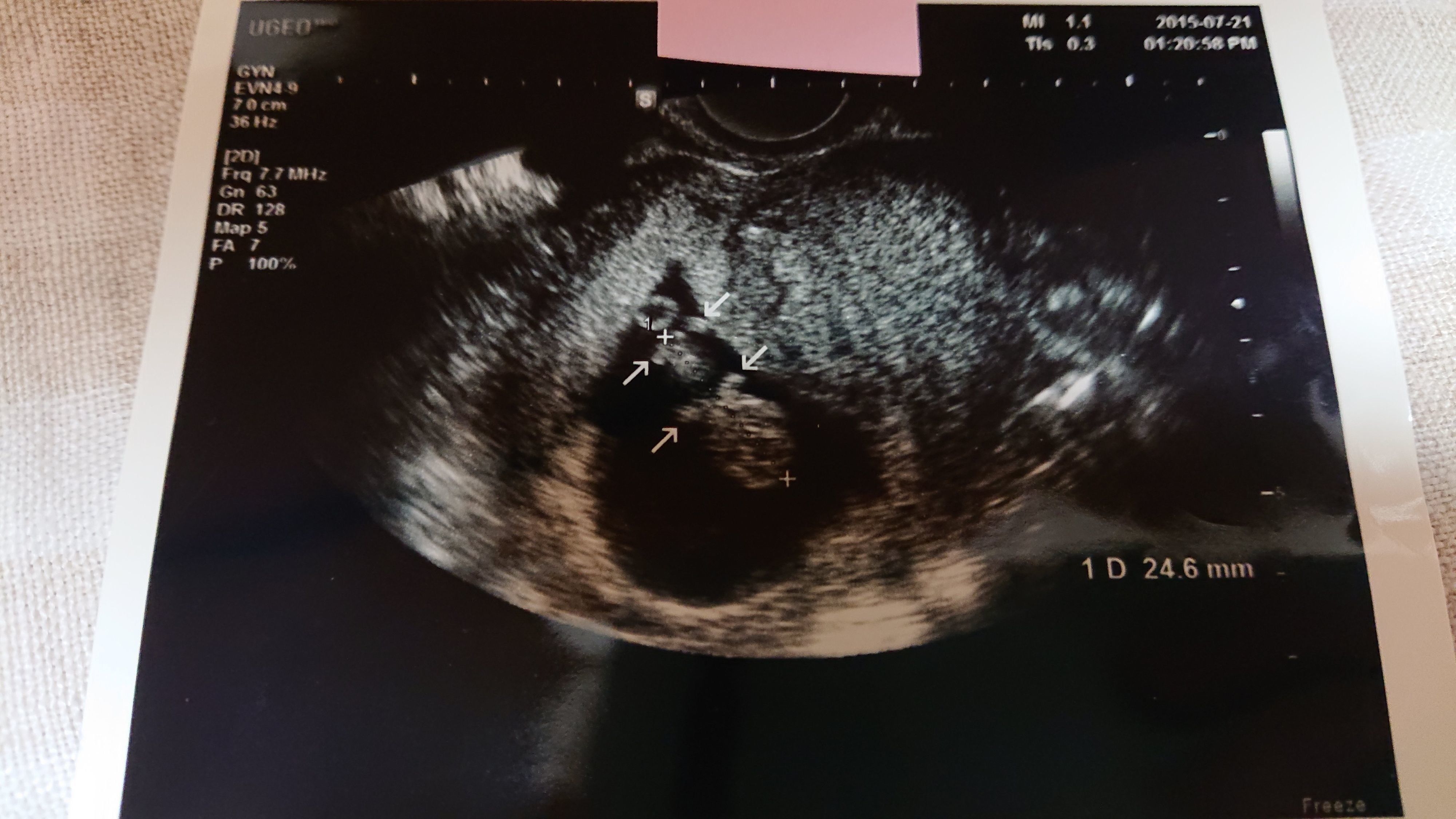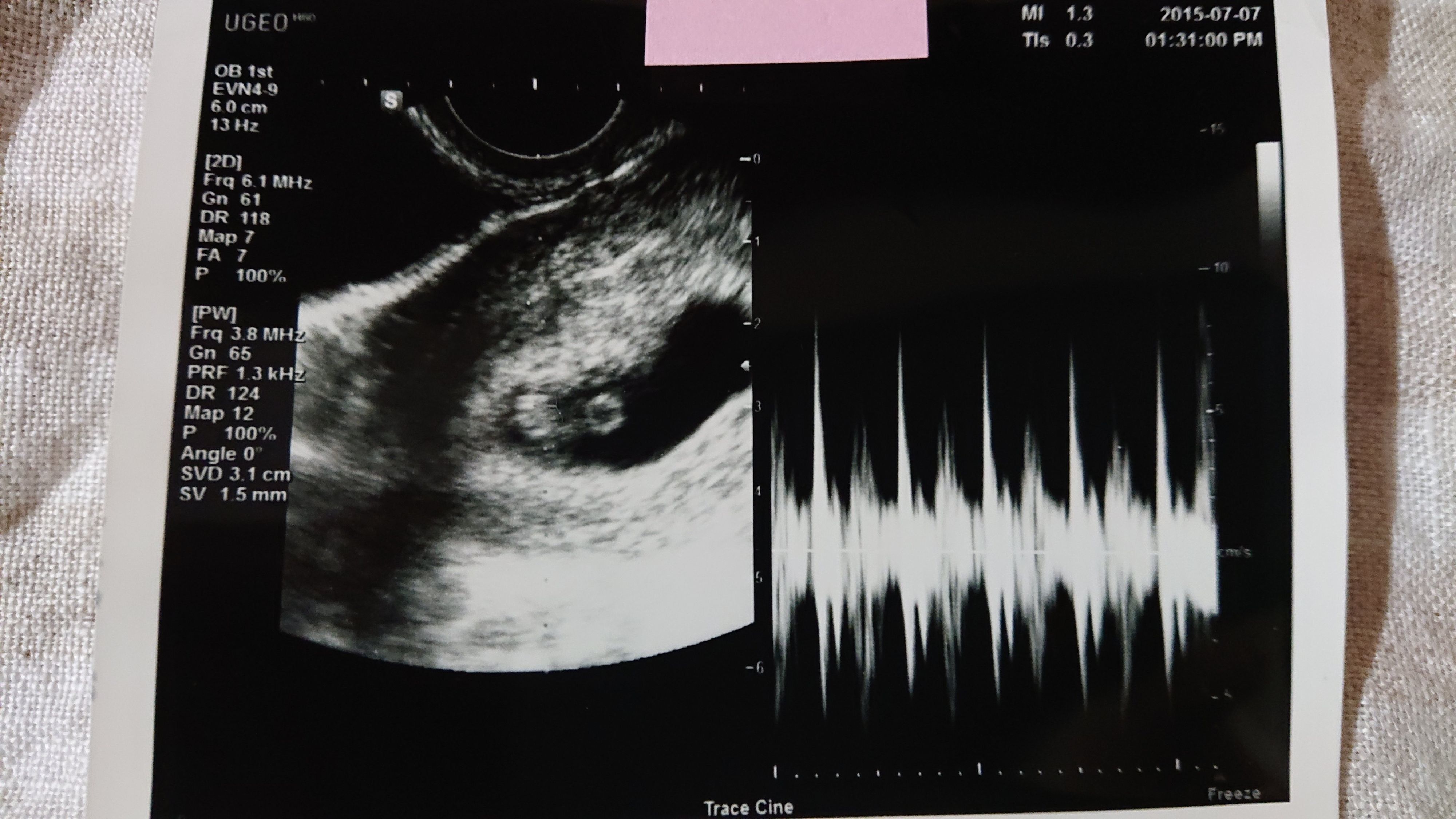 初めてのエコー検査からちょうど1週間後、赤ちゃんがおなかにやってきてくれたか、再度、確認する日がやってきました。まだ、赤ちゃんの姿は見えないけれど、胎嚢という赤ちゃんが育つためのお部屋が出来ているのを確認できました。胎嚢はエコー写真の黒丸部分です。私自身、「自分の体は妊娠できるのか」と長年不安だったので、前回は何も写っていなかったエコー写真を見たときは不安でしたが、今回は、くっきりと赤ちゃんのお部屋である胎嚢を見つけることができ、感動しました。