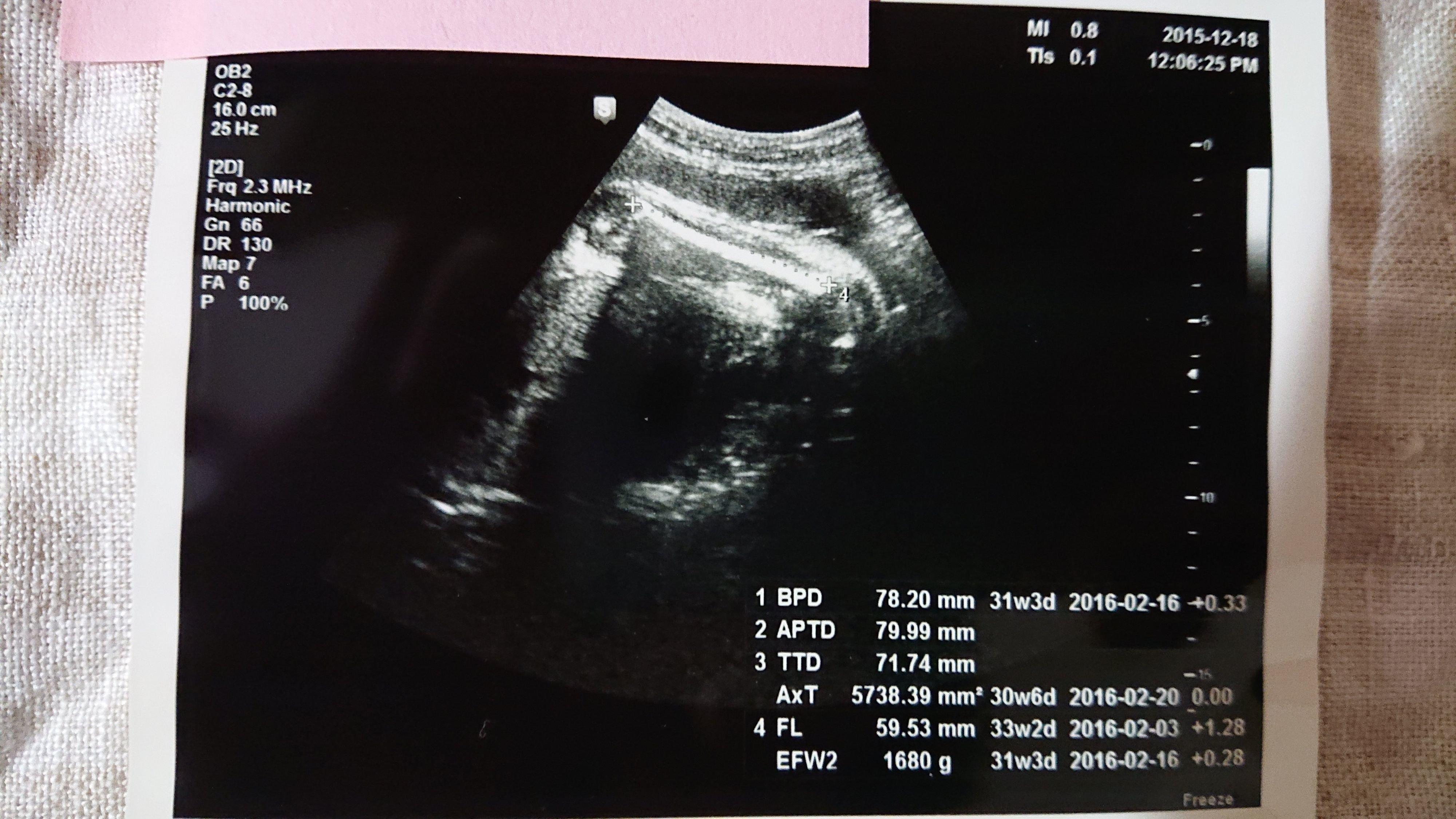 この写真を撮る2週間程前に切迫早産で入院してしまったのですが、入院してから初めて撮った30週目のエコー写真です。妊娠後期になってくると、赤ちゃんが大きくなりすぎて、ほんの一部しかエコー写真に写らなくなってきました。「赤ちゃんの顔が見たい」と思っても、この日は赤ちゃんの向きが合わずに見ることができませんでした。「赤ちゃんの向きによって、赤ちゃんの顔を見られずに終わってしまう時もある」と、医師に言われて、何だか残念に思ったものです。