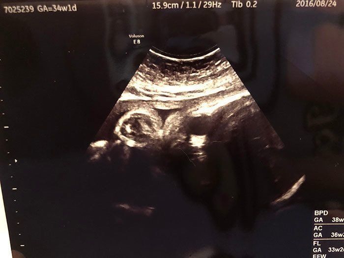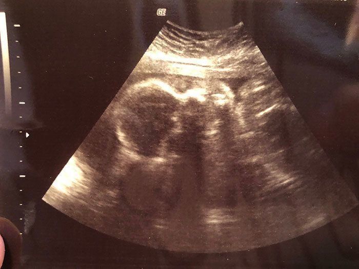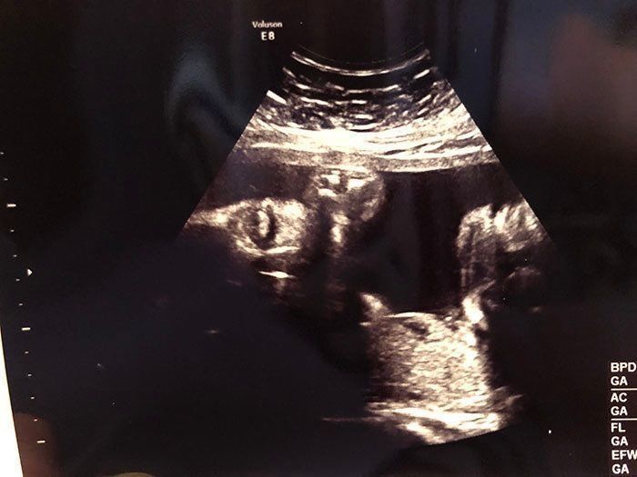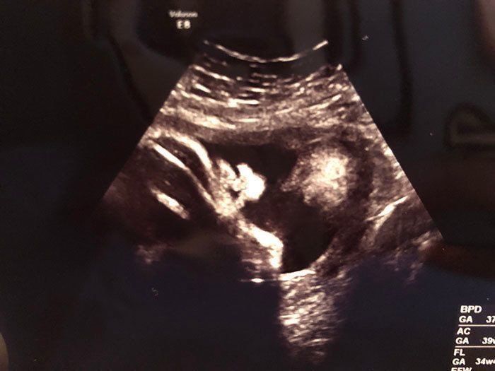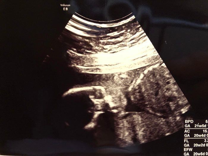 妊娠21週目のエコー写真です。すでにつわりが落ち着き、食欲も出てきた頃で、マタニティマークをつけていなくてもバスの席を譲ってもらえるほど、おなかが目立ってきていました。そのせいもあるのか、この時期は腰痛になってしまい、骨盤ベルトを常に締めて過ごしていました。